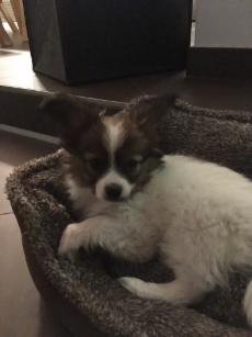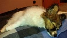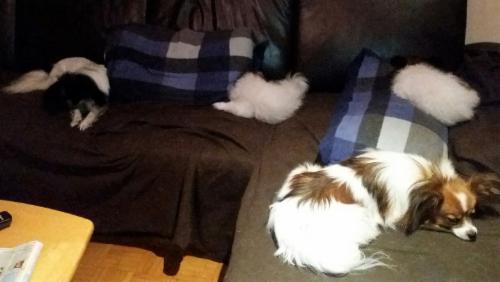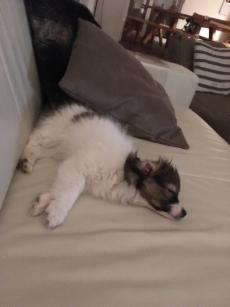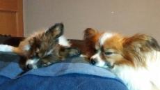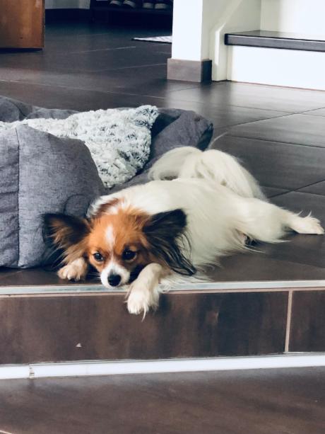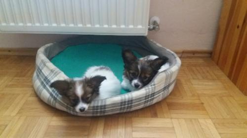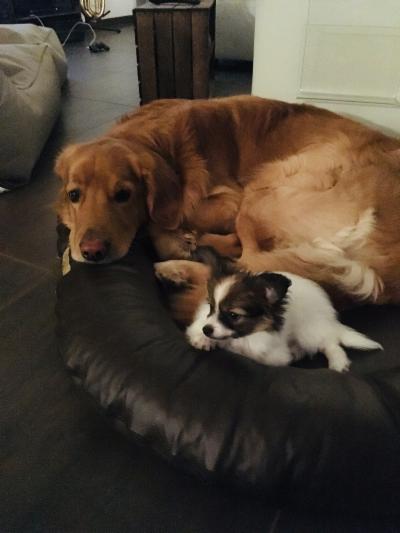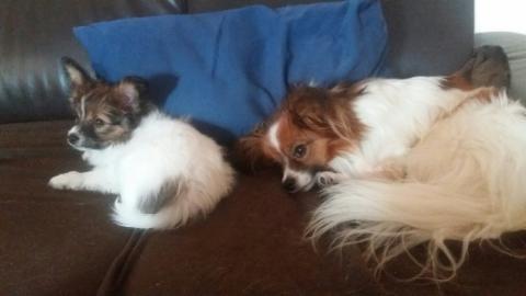 Eigentlich sollte sie ja nicht auf's Sofa dürfen! Aber sie fühlt sich auch in Ihrem Körbchen wohl und hat keine Angst vor großen Hunden. Immerhin ist das jetzt der "große Bruder".