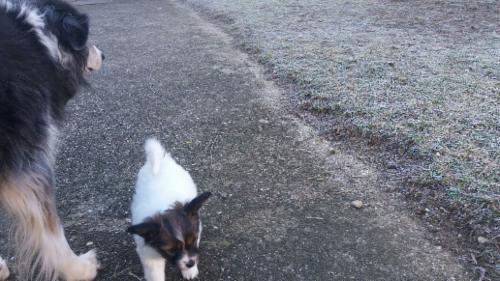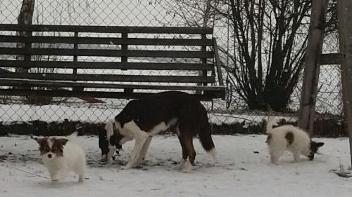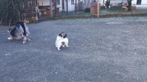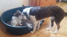 Der Sichtschutz zu den anderen Hunden wurde das 1. Mal entfernt. Eigentlich interessieren sich nur Jaggy (Papillon) und Amy (BC). Die anderen BC sind zumindest im Moment am Nachwuchs noch nicht interessiert. Sie wissen ja noch nicht, dass eins der "Monster" bleibt.