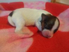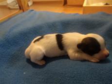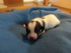 Tag 15: Gestern sind wir ins Wohnzimmer umgezogen, weil es Chilli im Welpenzimmer einfach zu fad wurde. Mittlerweile haben bis auf Drops alle die Äuglein offen. Drops ist einfach ein bisschen ein Spätzünder. Ich denke, morgen oder übermorgen ist es auch bei ihm so weit. Dobby war die Erste, die sich vorne schon mal hochgestemmt hat. Jetzt werden sie dann bald mobile!