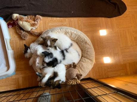 Tag 21: Bis auf bei Drops sind bei allen die Ohren offen. Sie erkunden jetzt schon aktiv die Wurfbox ein bisschen. Ich vermute, die nächsten 2-3 Tage findet der 1. "Ausflug" in den Welpenauslauf statt. Und dann steht der Erkundung der Welt nichts mehr im Wege!