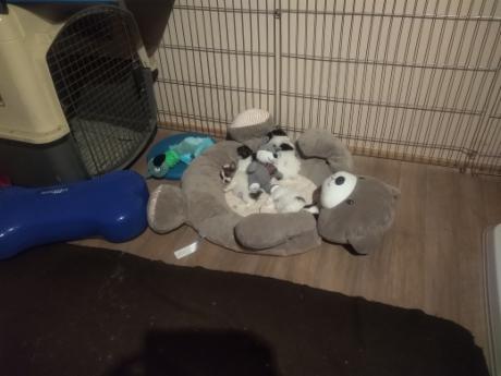 Tag 61: Heute morgen hatten wir schon sehr aufregende Momente! Wir sind zum Tierarzt gefahren zum Impfen und für die allgemeine Untersuchung. Alles ok, nur bei Drops ist im Moment nur 1 Hoden vollständig abgestiegen und der 2. zieht sich gerne noch ein bisschen zurück. Die Fahrt war ganz ruhig. Nur eines der beiden Mädels hat sich beim Zurückfahren leider übergeben. Vielleicht hätte ich sie doch vorher nicht füttern sollen. Aber dann hätten sie wahrscheinlich wegen Hunger ziemlich Rabatz gemacht. Jetzt sind alle geschafft und schlummern zufrieden im Welpenauslauf. Am Sonntag wird es nochmal spannend, wenn die Wurfabnahme ist.